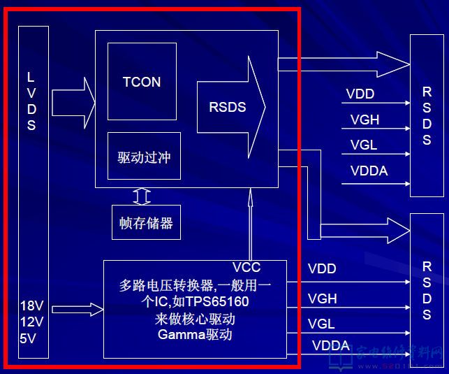 这两部分电路一般都是由一个IC和帧存储器完成,外围元器件少。LVDS信号直接输入块子,转换为RSDS信号直接输出。