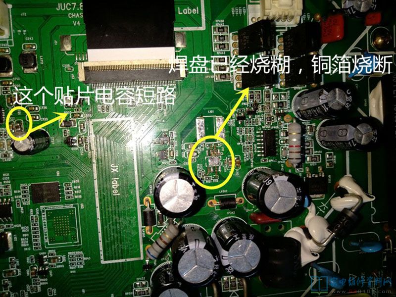 检测次级发现短路阻值为0,进一步先后查看发现一片DC-DC 8脚IC已经烧焦,旁边的贴片元件铜箔也已经烧胡,焊盘已经很难恢复原状,全部拆除清理。再测量次级+12V还是短路。逐段断开发现短路点在音频功放逐焊开音频供电滤波贴片电容10U短路(两组供电,一共有两个这样的贴片电容,我是拆到第二个猜对了),通电+12V出来了。