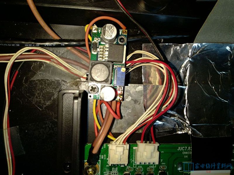 DC-DC转换没办法恢复了,在外面加上一块马云家的可调DC-DC转换模块,如图,首先调到电压最低,开机慢慢调高,测量后面三端稳压器的电压一直上升到3.3V后停止不再上升,说明损坏的DC-DC转换输出电压应该是+5V。把它调到+5V。关机再次开机。电视已经修复。