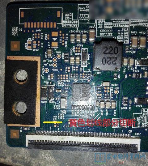 拆开机器测逻辑板12伏电源正常,各组电压,只有一个-8.5伏,其他的几乎没有。万用表测量芯片7-9短路,明显的auo m106-11损坏。由于本人焊工技术差,于是淘了一块逻辑板。装上试机,开机画面有了,但是时不时乱跳,auo m106-11芯片烫手,果断关掉电源。查屏边板原件,没有明显的短路,两个边板对称测量阻值几乎一样。于是装机测试边板,发现左边一旦装上,auo m106-11芯片就烫手。很显然,屏内短路。于是在逻辑板上割了一刀。(下面的图片有说明)。装机测试,auo m106-11芯片温热,画面良好。拷机数小时,画面稳定。