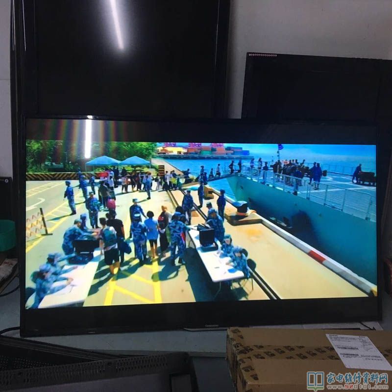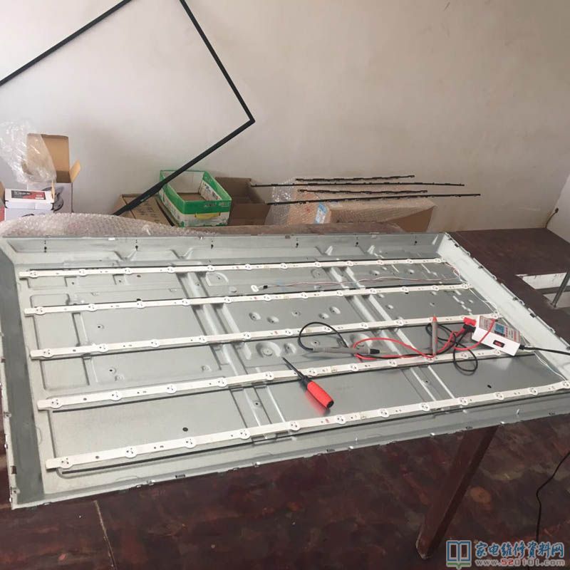 最近接修到一台长虹LED49C1080N液晶电视,有声音黑屏,心中一喜,机会来了,马上开机检查,该机LED灯只有二条线,也就是一地一正,用表测量开机有一电压跳变就无电压,估计是开路保护,因为过流保护一般屏会闪一下再黑,这台开机没有一点反应,所以先断定是开路保护,现在可以用我的之前买的测试仪来检查了,测试结果是开路,证实了我的想法,接下来只有开屏换灯了,马上和用户联系,和用户讲好维修的风险, 用户同意了,这是我首次单人开屏机会来了。
