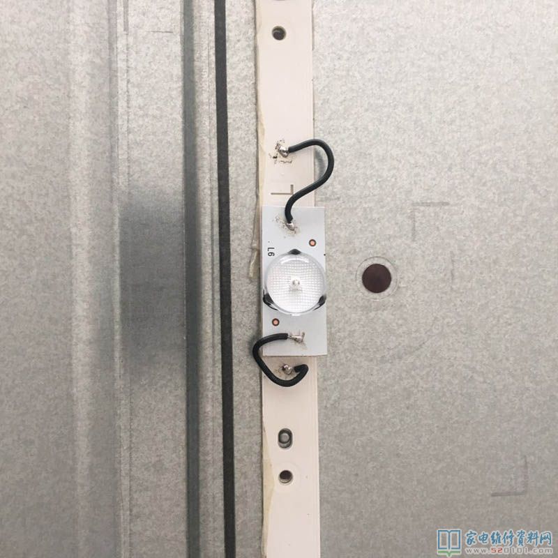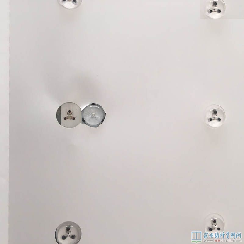 接下来就不用多说了,直接说怎么样找坏灯珠,其实很简单,该机是5组串联的,用测试仪分开找一下就找到了是一个珠子开路,具体看下面的图片,把坏的珠子取下,用刀子刮平,用单个灯珠用线换上,买来的灯珠是带外罩的,考虑到贴在原位子散热不好,就贴到了原灯珠的边上,现在用测试仪测试全屏都亮了,检查无误后小心还原屏,逆操作,这里不用多说,主要是小心,最后接逻辑板,全机接好试机就可以了。