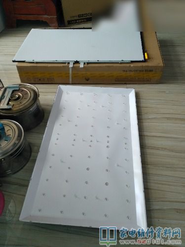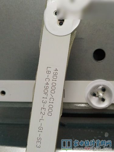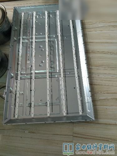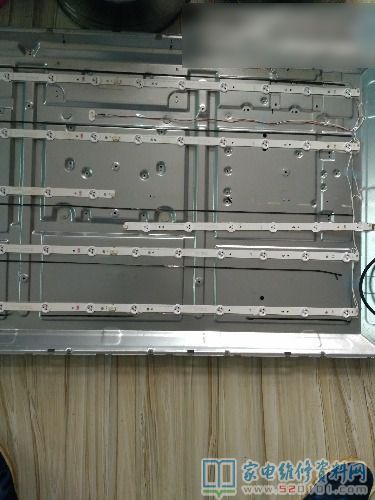 背板取下后,拆去卡子及反光纸,用灯珠表测得中间灯条不亮,拆下损坏的灯条,拆去透镜,用热风枪稍加热就可取下,发现一粒3v灯珠坏,因无配件,就在坏灯珠位置装了个1w3.1v稳压二极管,测试灯条可正常工作,少一粒灯珠亮度没什么变化,因为原机是60粒灯珠串联。至此将背板按原方向小心装回,恢复了电路,开机声象正常,下面是我拍的几幅如下图所示。