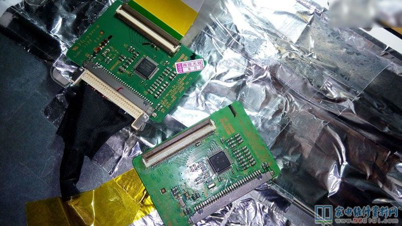 半小时后再开机发现故障又回来了,头疼哦。通电状态直接热风枪再吹芯片,好了。至此,为我后面的30元挖了个坑。网购此小板20元加10元运费,今天到了就急忙换上,我的个乖乖,胡汉三还在啊。完蛋了,是屏?可是只要一吹芯片就马上好了啊,这不应该是屏的事。是板子有过孔生祸?可是没理由两个板子出现一模样的坏法啊,这也说不通啊。仔细想想整个过程,莫不是板子被什么干扰所致?换掉这跟60pin的排线也不见好,开机,手拨弄排线和小板有了新发现,把板子托高点居然不怎么闪了,看到小板下面是塑料再下面就是屏内部的灯管,马上拿出先前买来备用的铝胶带,把这部分塑料从左到右都给贴上,最后还特意加贴一道跟主板下面的铁板贴牢实。试机,呵呵那叫一个完美。这里有个最后的成品图样,全靠这神奇的铝胶带,当然板子下面的地方加贴了塑料胶带的。(背光是LCD灯管的,由于灯管采用高压点亮,灯管或接插件不良就自然产生干扰。太强烈的干扰贴锡纸屏蔽也无效就只能是开屏从根源处理)