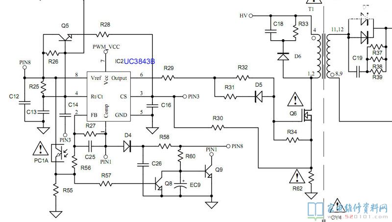 既然有时正常,那么3843 肯定没问题,着重查 保护电路,电流检测几个电阻正常,基准电压也正常。那么问题肯定就出在 误差放大 经常分析电路, 1脚的误差输入电压直接Q9 c集,而8脚的基准电压经过R60至Q9基集,邮EC9充电延时,当24V输出正常后,2脚误差输出经过R56 和光耦取样电压经过R57至Q8B集在EC9还未充满时 Q8导通 Q9 自然还是截止。电压为0 C集误差正常。既然有个延时电路,而本问题也貌似就是跟延时有关。二话没说拆掉换之 ,故障排除。24v电路如下。