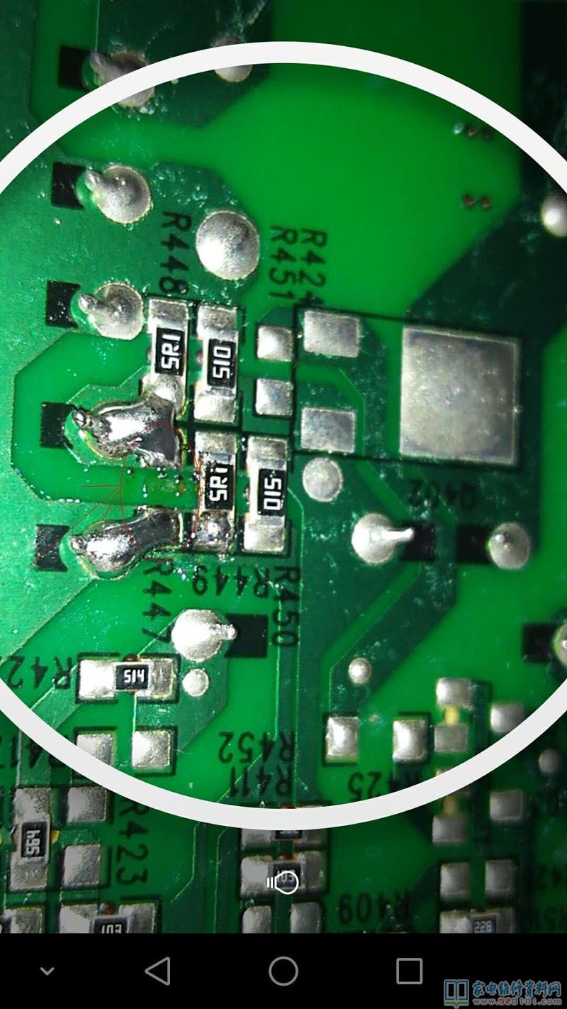 前一段时间已接修两台只损坏一个灯珠的长虹电视,一台长虹LED49C1080n,另一台55寸长虹用户守着现修的没记型号也没拍照,都已交给用户,网上有同志们说返修可能很大,心里也觉得不踏实,今天上门说服客户取回电视开始试着改,改变前窜入电流表读数为420毫安,增大电阻后电流减小为300毫安,见下图所示,把红圈内去掉即可。