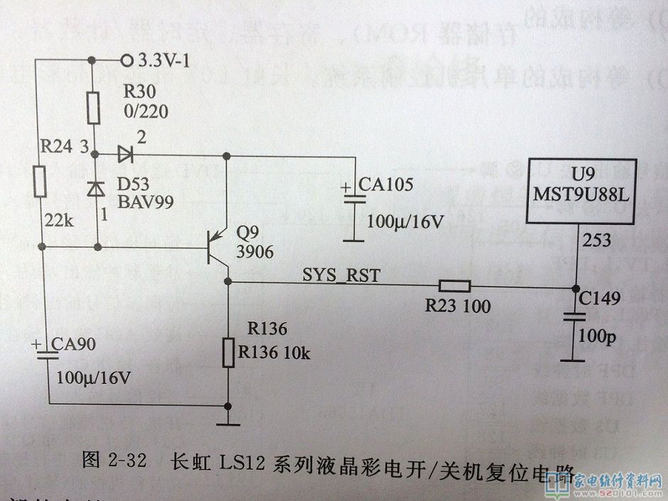 长虹LS12系列液晶电视,例如LT32600就采用这种开/关机复位电路,该电路由主芯片MST9U88L及外接三极管Q9等元件组成,如下图所示,开机时由于R24阻值较大,CA90的充电上升慢于CA105,故Q9饱和导通,其C极输出高电平。