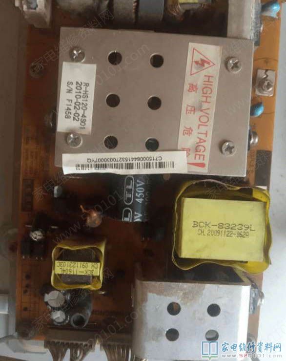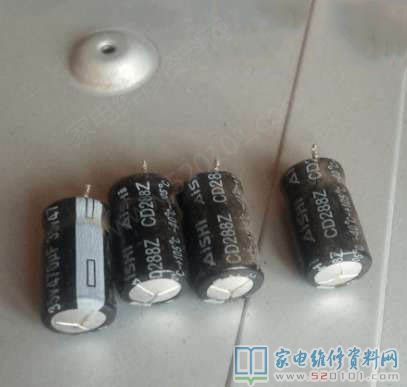 接修一台长虹LT32710液晶电视,此机为LCD背光,以为又要改背光了,开机发现没背光,屏里也没有隐约图像,可是有声音,故障点又由背光一下转移到了电源板上,开盖检查,直奔24V测试点,果然电压只有19V,电压低首先就想到了电容,但是电容全部躲在散热片下,已有四颗电容处于鼓包状态,35V/470uF,由于手头上没有,到旧板拆了两个,实在找不到了,另外两个用一个35V/1000uF的代换,开机,24V正常,故障修复。