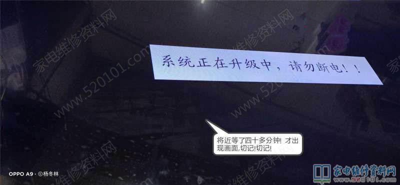 结果插上U盘,上电按待机,只见电视出现“系统正在升级中,请勿断电!”字样,电视就一直这样候着,这时候就考研人的耐心了,如果你中途断电或拔掉U盘了,也许这台电视就成砖了!足足等了近四十多分钟才见电视出现重启,接着启动画面正常启动,这次接信号线,图声终于正常了。