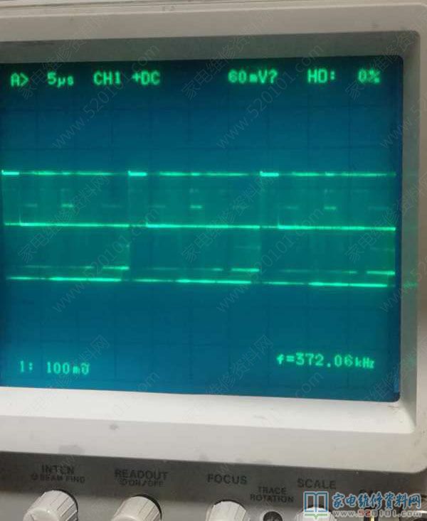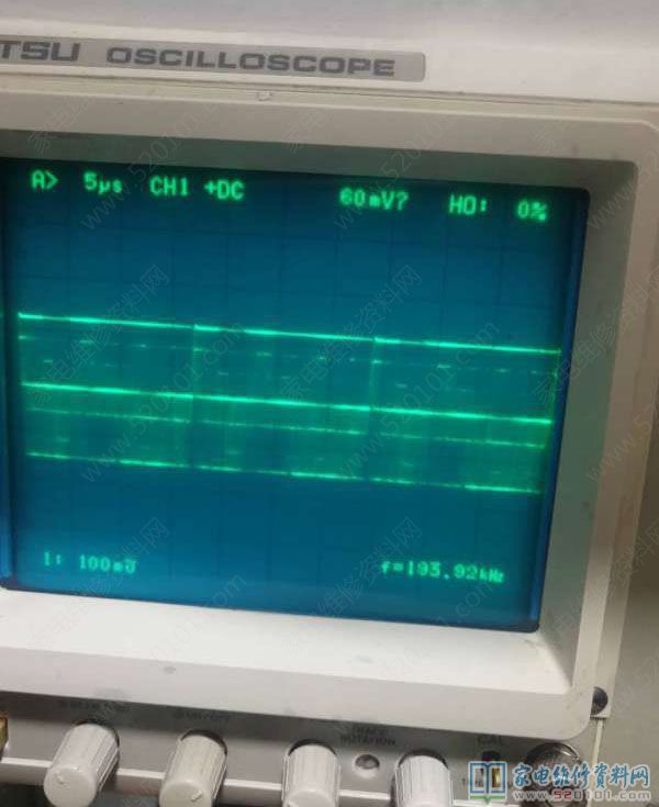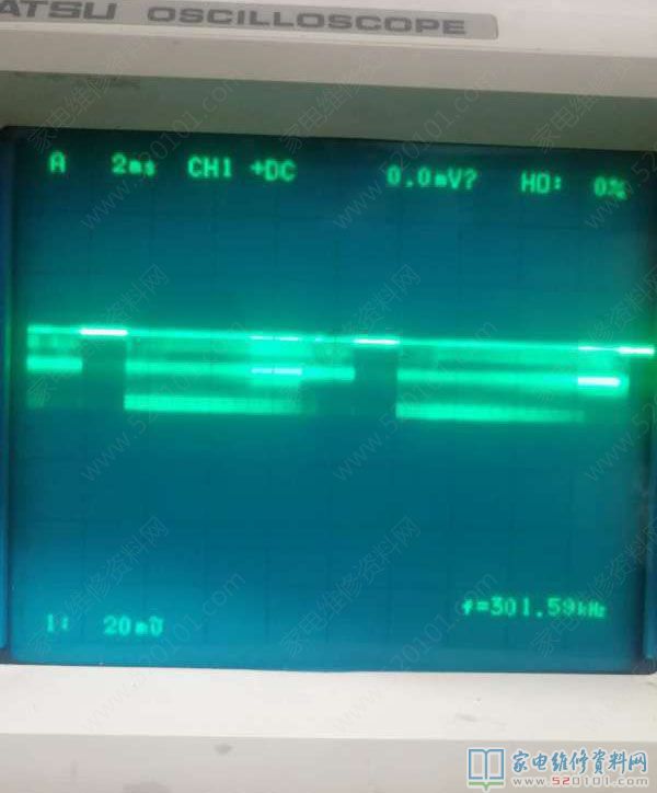 最近接修一台长虹LED32B2100C液晶电视,故障表现为花屏。根据以往案例,此故障现象以前较多见的是LVDS线插排接触不良,开壳直接清理排插无效。由于是小信号万用表不易检查,直接用示波器观察LVDS各信号波形,查到屏边板端LVDS线排的25.26脚发现波形异常(如下图4和图6所示),进一步确认LVDS线有问题,更换后图像正常,图8为正常波形。(示波器型号是岩崎SS-7810)