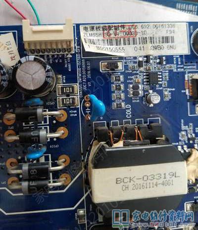 测量电源板上灯条插头上的电压用遥控开机后测不到一点电压,用灯条测试仪点亮灯条后开机可以看到正常的图像,只是亮度比平时暗一些(灯条测试仪工作电流比原机电流要小不少),说明问题就出在电源板上的背光电路。