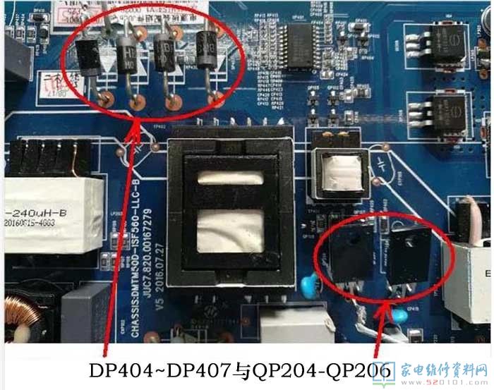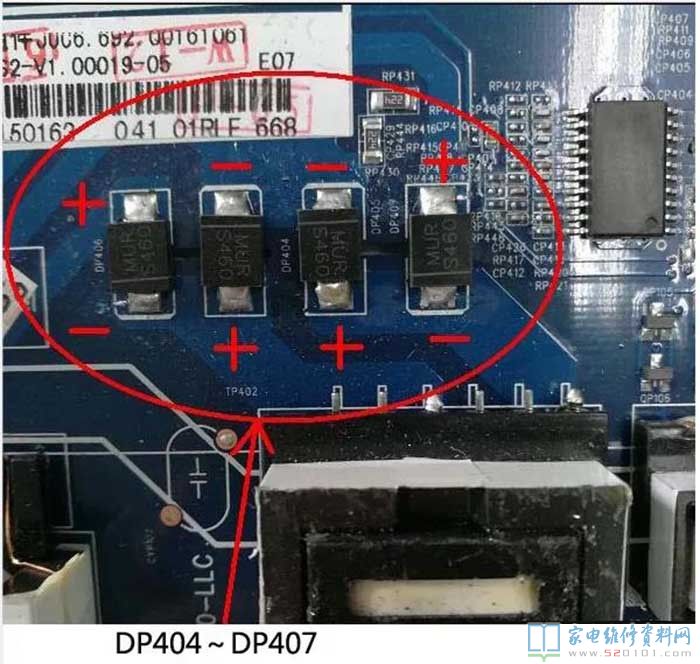 分析检修:由于QP204、QP206击穿,通常会引起保险管FP101(5A/250V)熔断,从而出现三无故障。导致QP204、QP206损坏的常见原因是背光LED+电压整流二极管DP404~DP407中的一只或几只击穿,这几只元件的位置如图1所示。