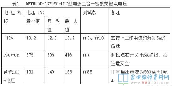针对长虹DMTM50D-1SF560-LLC型电源二合一板主要用在长虹55U3C(ZLS58G-i机芯)、55Q3T (ZLM65HiS2机芯)等型LED液晶彩电中。该板的关键点电压见表1,其常见故障如下。