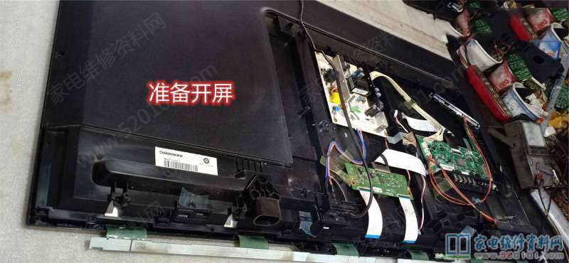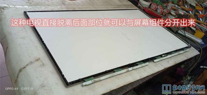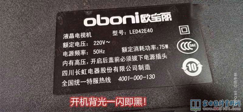 最近接修一台欧宝丽LED42E40液晶电视,开机见背光一闪即灭,就知道要拆屏维修,和客户谈好价格后,立即动手拆屏。等拆下电视后盖的螺丝后,发现此电视开屏只要把后面部位拿下来,就与屏组件分离出来了。相对简单些,风险因素也减少很多。