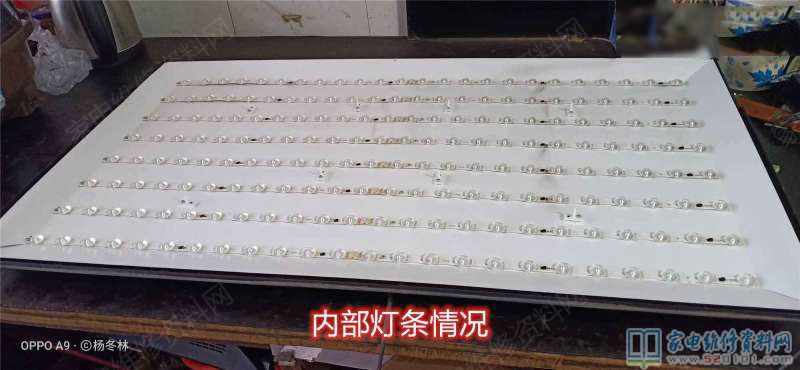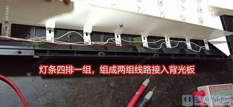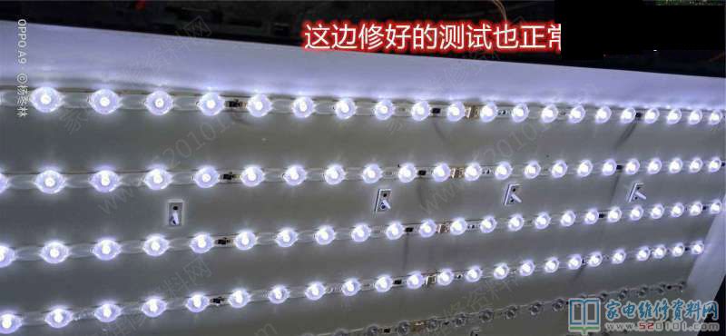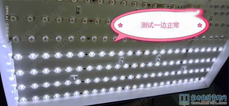 直接移开屏组件后,拿上电视后部,用检测仪测试,发现只有三个灯珠损坏,手边正好有这种灯条。于是剪三个灯珠,用导线直接联起来,重新测试,全部点亮,整个操作过程如下图所示,供大家参考。