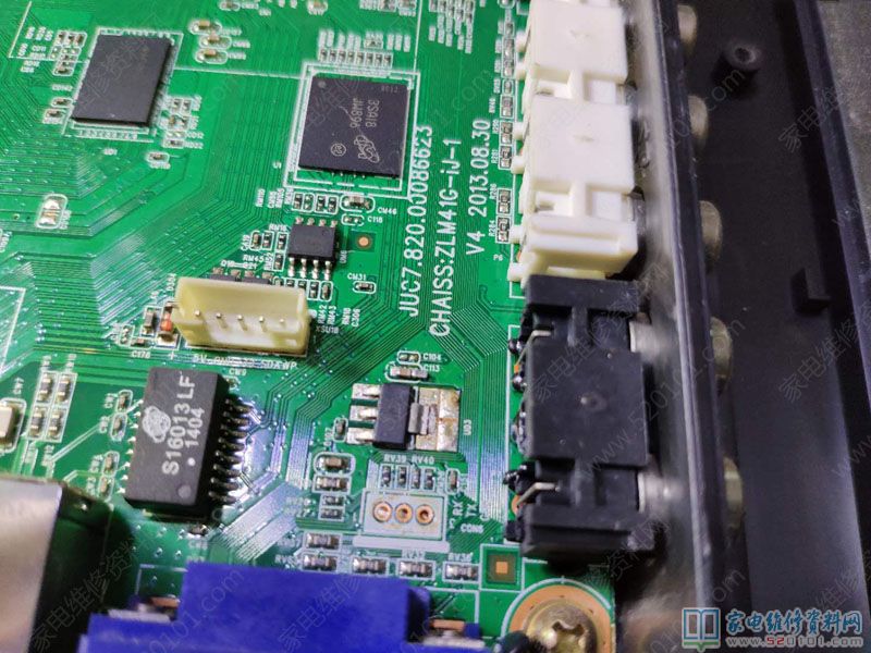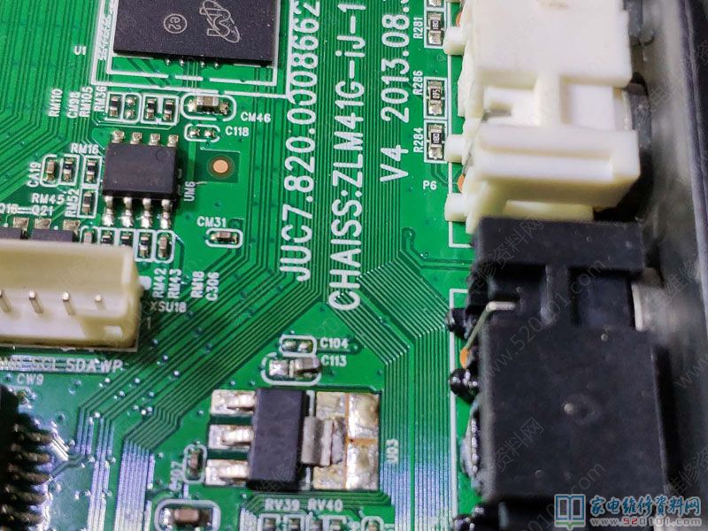 一台长虹液晶电视LED32C2080I红灯亮不开机,检查发现无论遥控还是键控指示灯不反应,于是开盖检查,结果发现背光点亮,当时还以为屏幕坏了,不过当我测试屏幕边板发现没有12V,测试主板到电源板控制电压,PSON、BLON都是高电平,这个时候以为屏幕供电电路出故障,不过查过没有问题,屏幕不供电是主板没有控制电压,看来还是主板不正常工作,在检查主板工作条件发现图片三端U03无电压,手摸烫手,结果测试它输出端几乎电阻为0,当时感觉麻烦了,因为它供电到那些芯片没有图纸检查麻烦。不过凭经验还是它后面滤波电容坏的可能性大,后来逐个测试后面电容,居然第一个C113就查出短路了,这的确是运气了。于是换了3.3V后一切正常,当然插电二次开机指示灯闪烁几次,电视及修复。