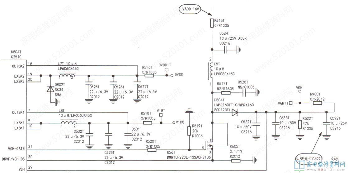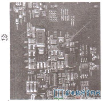 分析电路,逻辑电路中的电源芯片U804T(G2510)在得到上屏电压12V-VCC_ PANEL后开始工作,并从其③脚输出驱动脉冲信号VGH_ GATE,去驱动MOS管U56T的导通和截止。当vGH_ GATE驱动脉冲信号在正半周时,U56T(N沟道)的漏极得到VADD(16V)电压使其工作于导通状态,并通过对电感L5T进行充电储能;当驱动脉冲信号VGH_ GATE在负半周时,U56T截止,电感L5T开始释放能量并与16V电压叠加,再经过D804T隔离,电容C532T、C592T滤波,形成VGH开启电压30V。VGH电压异常(其线路相关元件存在损坏),在检查U56T.L5T.D804T均正常的情况下,断开滤波电容C592T,VGH电压立刻恢复30V左右。更换同规格电容C592T( 10uF/25V ),故障排除。相关电路如图22所示,实物检测点如图23所示。