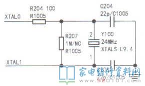 再测两脚对地阻值分别为3.19k和3.29k,正常。更换晶振Y100和两只贴片电容C204、C208,故障依旧。在排除主芯片U201外围元件均无问题前提下,将主芯片上BGA返修台进行更换处理后,上电检测Y100两脚电压,已恢复为正常的1.61V、1.63V,将主板回装后试机,故障排除。相关电路如图2所示。