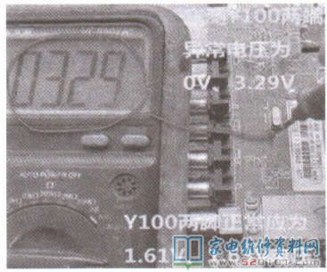 接修一台长虹50D2000i液晶电视(ZLS59GiD机芯)故障表现为不开机,分析检修:由于该机为不开机现象,先通过串口打印工装连接主板,查看开机打印信息,没有显示任何信息,判断主板有问题。将主板取下连接上“修机王"工装进行检修,结果上电后还没二次开机,连接“修机王”的,上屏转接板中绿色发光二极管已点亮(不亮说明正常)。接着测量主板上屏插座JP7的①~④脚电压为12.01V, 且二次开机后屏幕也无任何反应,说明虽然已产生了上屏12V供电,但主芯片是否完全正常工作有待进-步检查。随后检测待机和时序控制电压+12V_ Normal、+5V_ Normal及+5V_ Standby. +12V、VDDC. .1.15V、VDDC_ cPU_ 1.15V、+1.5V_ DDR等均正常,只有供电并不能证明主芯片U201 (MSD6A628)的MCU已开始正常工作,于是继续检测其复位、键控和总线,也都正常。检查晶振Y100( 24MHz)两脚电压时发现一脚电压为0.01V,另一脚电压为3.29V,明显异常,如图1所示。
