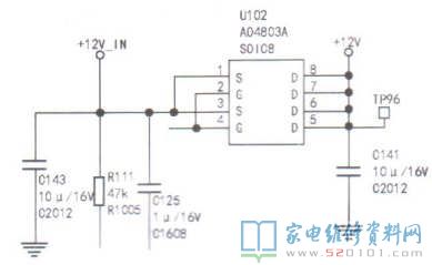 检测待机控制电路切换芯片U102( A04803A)的①、③脚,有+12V_ IN电压输入,开/关控制脚②、④脚低电平,⑤~⑧脚输出电压为0V(正常的控制输出电压为+12V)。断电,在路测量+12V对地的阻值很小,说明+12V线路上负载有短路(排除U102自身短路)。顺路逐一断开+12V 电路负载,检测发现由+12V通过U11(MP1499 )形成的USB_ 5V上的滤波电容C97短路,更换后对地阻值恢复正常。怀疑U102损坏,更换C97后12V电压恢复正常,故障排除。相关U102电路如图1、图2所示,实物检测点如图3所示。