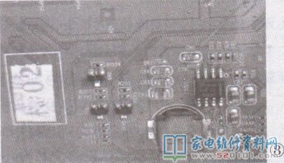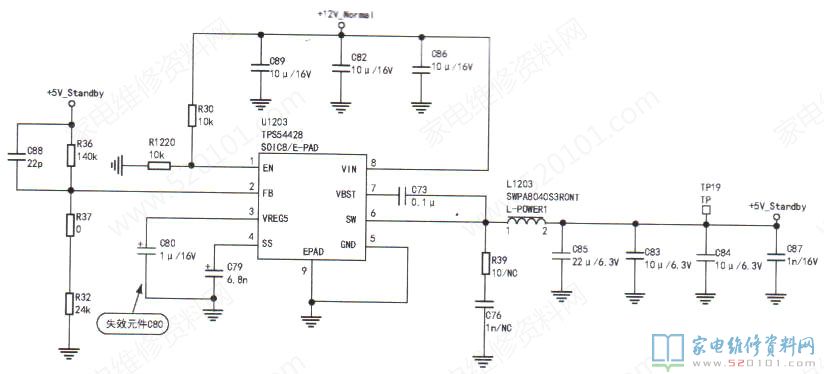 接修一台长虹55A1U型机(机芯:ZLS58Gi4X),故障现象为不开机。通电后观察到,指示灯比正常亮时偏暗些,此时感觉应是待机电压不正常引起的。为证实判断,打开后盖,首先测量主板的待机电压处电感L1203输出端+5V_ Standby 电压,只有4.2V;再测由+5V_ Standby 通过U11 (LDO) 转换成+3.3V_ Standby 提供给主芯片的待机电压3.3V,只有2.4V。因指示灯、遥控、主芯片复位等正常工作均需待机5V和3.3V电压提供,所以,指示灯偏暗和不开机故障,-般都是待机电压偏低引起的。由于待机电压5V偏低(5V偏低使3.3V也偏低),所以只需检查待机5V电压电路即可(是在断开负载,待机电压5V仍然偏低的情况)。检查+5V_ Standby形成的电源开关控制芯片U1203(TPS54428 )各脚电压,发现③脚只有0.2V(正常应为5.5V),怀疑其外围滤波电容c80损坏,拆下检查发现该电容已无容量(无法对该芯片内部电源起到储能和有效滤波),进而欠压锁定动作,误导调整输出电压。更换同规格电容C80(1pF/16V),开机测量待机5V和3.3V均正常,图像也显示正常,故障排除。