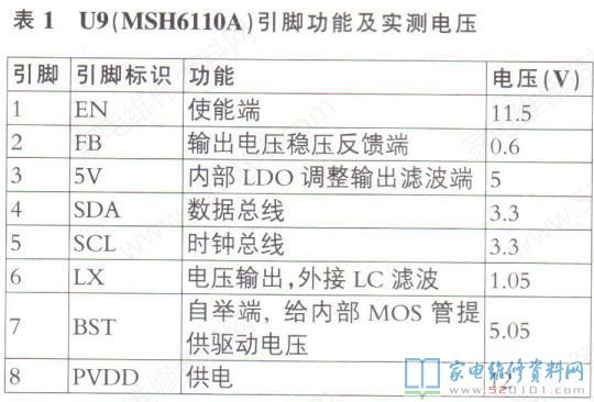 接修一台长虹60Q5R型机(机芯:ZLS70Hi),故障现象为不开机。通电指示灯亮,二次不开机,首先检查由电源板送至主板插座J1的①④脚12V电压,正常。进一步检查由+12V-IN通过多只DC-DC转换成的+5V_Sandby. +3.3V_ Starndby、+12V Normal、+1.05. VDDC_ cPU、+1.0V. DDC.+1.5V DDR、+5V_ Normal. +3.3V_ Normal.+1.8V_ Normal电压(这些电压提供给主芯片、EMMC.DDR等,使其正常工作),若任一供电电压异常,均会造成不开机故障。检查发现,电感L3输出端没有+1.05_ VDDC_ .CPU( 内核)供电,由此说明不开机是提供给主芯片的CPU(内核)供电发生异常所致。接着分析提供给主芯片的+1.05. VD-DC_CPU (内核)供电的形成过程:U9(MSH6110A)为PWM电源开关控制芯片(DC-DC转换块),从其⑧脚输入12V电压,在主芯片的P5.P6脚输出PC总线的控制下,从其⑥脚输出PWM脉冲信号,经过L3储能、C33~C35滤波,从而形成1.05V内核电压;另R5.R25对输出的1.05V电压进行跟踪取样,所得电压送入其反馈②脚,与内接0.83V基准电压进行比较,从而调整⑥脚送出的PWM脉冲信号,实现输出电压的稳定。U9引脚功能及实测电压见表1所示。