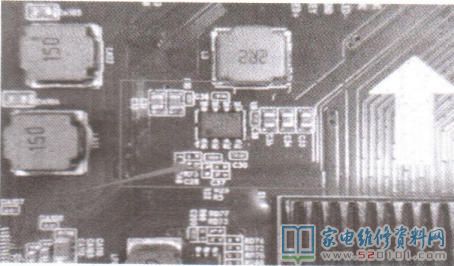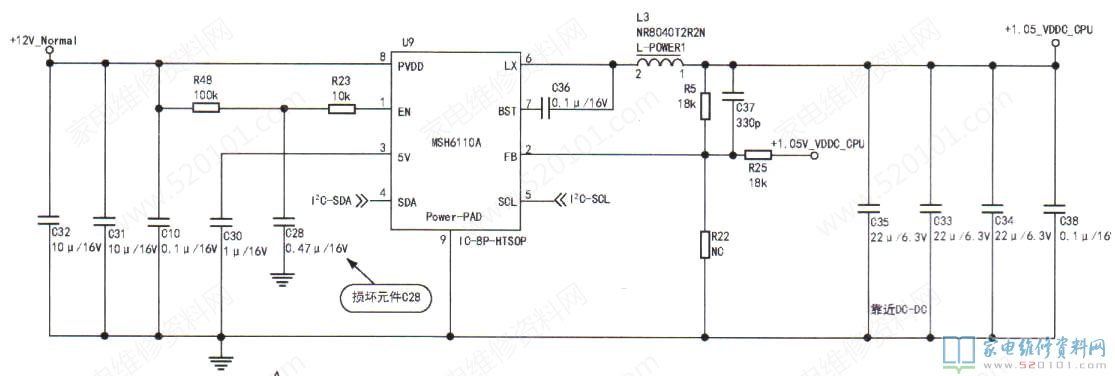 由于+1.05_ VDDC_ CPU供电是由DC-DC转换块U9形成,所以先检查其⑧脚输入的12V供电,正常,总线电压3.3V也正常,最后检测发现其①脚使能端电压只有1.2V左右,断开并检查外围电容C28,已短路,将其更换后,开机图像恢复正常,故障排除。故障部位电路及实物元件如图1、图2所示。