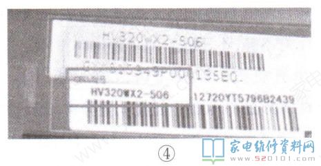 一台LED32B6型机,更换主板后图像异常,如图1所示。拆机检查,新换主板的条码如图2所示,"2A”对应的屏型号是HV320WHB-N81;原主板条码如图3所示,“0A”对应的屏型号是HV320WX2-506。