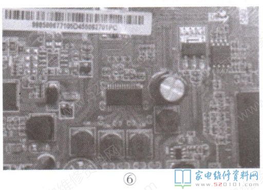 接修一台LED32B6 型机,不定时出现无伴音,交流断电后又可暂时恢复正常。此故障原因是输入电容(贴片电容,220uF/16V )异常导致功放IC进入保护状态,需要更换C131.C146.C147.C142,其位置如图6所示。