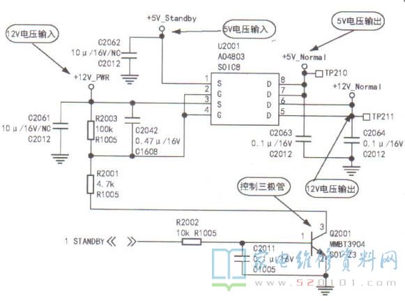 在检测中,发现U2001(AO4803A,双P通道增强型场效应晶体管MOS电源控制电路)的⑤、⑥脚输出正常的12.1V电压,而⑦、⑧脚输出电压只有0.6V(正常为5.1V),说明该路有故障。检查U2001的⑦、⑧脚外围滤波电容后端负载电路,以及双栅极的控制三极管Q2001和周围元件,均正常。于是直接更换U2001,二次开机后图声恢复正常。相关电路如图2所示。