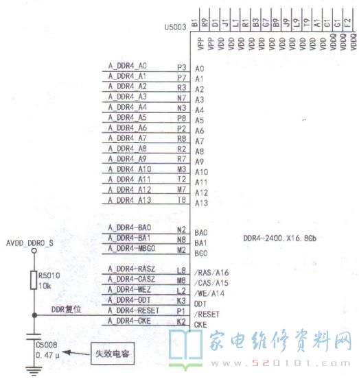 接下来检测DDR供电:+2.5V_ DDR、+1.5V_ DDR、+1.2V_DDR,均正常;检查通讯之间的排阻对地阻值也没有发现异常(无异常即可排除印制板过孔不通的故障)。于是更换DDR芯片U5003,但故障依旧。仔细分析线路,发现DDR芯片正常工作除了供电、通讯信号、地址信号外,还需要复位信号正常,该复位动作同样也是刚开机为高电平1.2V,后转换为OV低电平进行复位。顺路检查,发现复位电路中的电容C5008已开路,使复位信号始终处于高电平状态。更换同规格0.47uF电容后,故障排除。相关电路如图2所示。