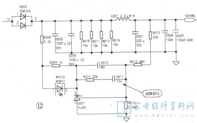 但发现电容C511有点虚焊,重新补焊后开机,24VBL输出电压恢复正常。分析其原因:C511与R514串联构成低频消振电路,对24VBL输出电压起到抗低频干扰作用,如果消振电路元件电容C511漏电(可去掉C511,24VBL电压输出也正常,但开关变压器会发出很大的噪音,这也是判断c511是否漏电的方法之一),低频干扰就会使U501三端稳压值波动(TL431灵敏度高),进而使光耦N401初级发光量及次级光敏三极管的导通率发生变化,并反馈于驱动芯片U401(NCP1393 )的②脚,使内部输出的驱动脉冲带宽变化而直接影响24VBL电压的正常输出(C511 漏电故障率较高)。更换电容C511( 100nF ),故障排除,相关电路如图1所示。