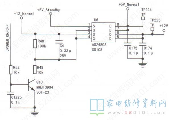测量U6各脚电压,发现①.③脚的输入电压正常,但⑤~⑧脚输出电压均为0V,测得Q10的基极电压为0.6V,这说明主芯片u201已给出高电平开机指令,判断U6损坏,换新后故障排除。