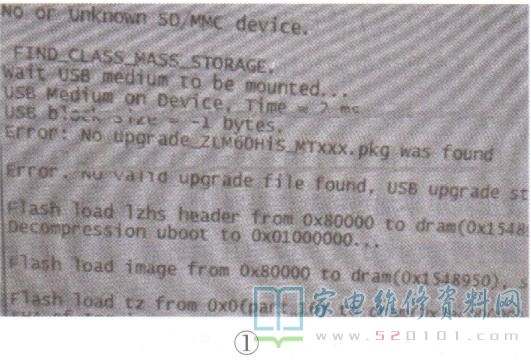 一台长虹UD55D6000i ( 机芯:ZLM60H-i)型液晶彩电,不开机,指示灯不亮。分析检修:对于使用ZLM60H机芯的长虹整机,故障较多的是印制板过孔不通,尤其是热机关机后不能再开机现象较为普遍。对此,先将主板连接串口打印工装查看打印信息,发现二次开机后, 打印信息显示为硬件自检后无法再继续下去,故怀疑引导程序损坏,于是重写引导后开机,再用U盘升级,但系统提示始终找不到相应软件升级包,如图1所示。随后仔细检查U盘中的软件升级包,发现其文件名不对,如图2所示。