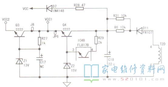 当以IC2(L6599)、T1等元件组成的主电源不起振时,主电源无输出,主板二次开机后的工作电流就完全由待机电源经RS28供给,电流较大时会烧毁RS28。断开D13,人为给PS-ON、BL- ON、PWM端加上高电平,主电源仍无输出,由此判断主电源异常。检查主电源芯片的VCC供电电路,如图所示,发现稳压二极管Z1(13V )损坏,将其换新后故障排除。