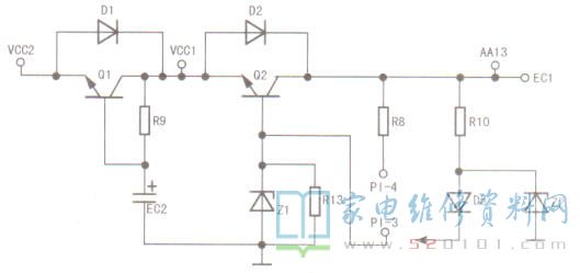发现Z2在路阻值异常。Z2采用SOT-23封装,其①、②脚接在一起,取下测量其①、③脚的正反向阻值均为2702,②脚对①、③脚阻值都为∞。在Z2旁边有个Z1,封装形式相同,但Z1①、③脚的阻值约为700Ω,判定Z1损坏。Z1 上标示为Y8,查询资料得知其型号为BZX84C22,实为3脚封装的22V稳压二极管。由于手头没有该元件,换上一只2CZ系列的22V稳压二极管后试机,故障排除。