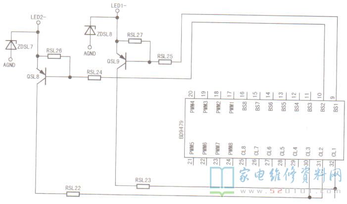 发现电阻RSL25(02)开路。更换RSL25后开机,测量背光驱动输出LED+电压高达90V,而电源板上面标注的LED+电压为68V;测开关电源输出的背光供电为57V,比正常值47V高出10V,怀疑电源板稳压电路有问题,但同由开关变压器T1输出的12V电压却很稳定。检查开关电源未发现问题,转向检查驱动电路。对比测量LED1、LED2-端相接的恒流控制三极管QSL8、QSL9, 发现QSL9的c、e极间断路,换新QSL9后试机,故障排除。