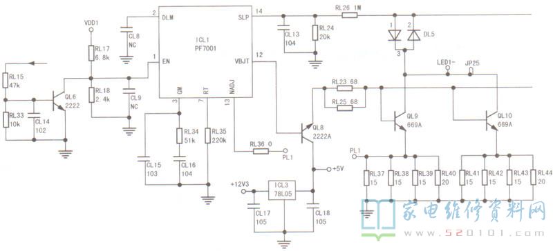接修一台LED55C2000i型机,故障表现为开机后背光不亮。此机采用JCL35D-2MC400型电源板。通电,检测电源板输出的12V正常,背光驱动电路供电为70V,但LED灯串的LED+电压为69.8V,说明背光升压电路未工作。该电路以ICL1(PF7001 )为核心组成,如图所示。