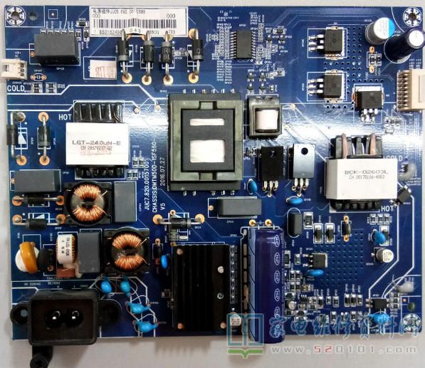 接修一台长虹50Q3T型液晶电视,三无。该机上电后指示灯不亮,说明电源或主板有故障。先在路测量电路板,无短路现象。上电,测量电源板的12V输出电压只有2.4V,断开主板后该电压还是2.4V,说明故障在电源板上。测量电源芯片UP102 的启动供电在开机瞬间约为15V, 基本正常,转向检查振荡、反馈、取样、保护等电路,将精密稳压块UP808(TL431)断开上电,输出电压可达18V,说明问题在稳压电路中。测量取样电阻正常,代换UP808后试机,故障排除。