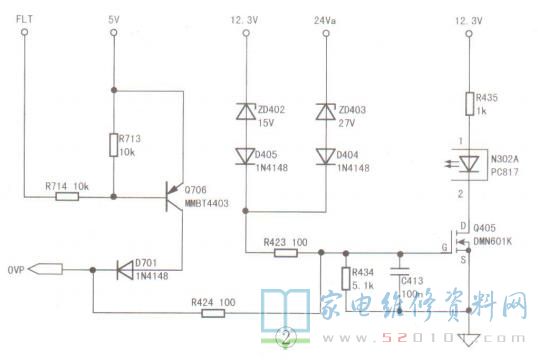 CAT4026①脚(oCA) 检测到灯串开路(LED+电压升高)后,会从⑨脚输出低电平的错误指示信号;四脚( SCA )检测到灯串短路后,会从D脚输出低电平的错误指示信号。这两路信号短接在一起形成FLT信号,若该信号为低电平,则三极管Q706导通,输出高电平的oVP信号,送往过压保护电路,如图2所示。这时Q405及光耦N302导通,主电源芯片U402(NCP1271A)停止工作,从而出现二次开机后+12.3V、24Va电压下跌的故障现象。