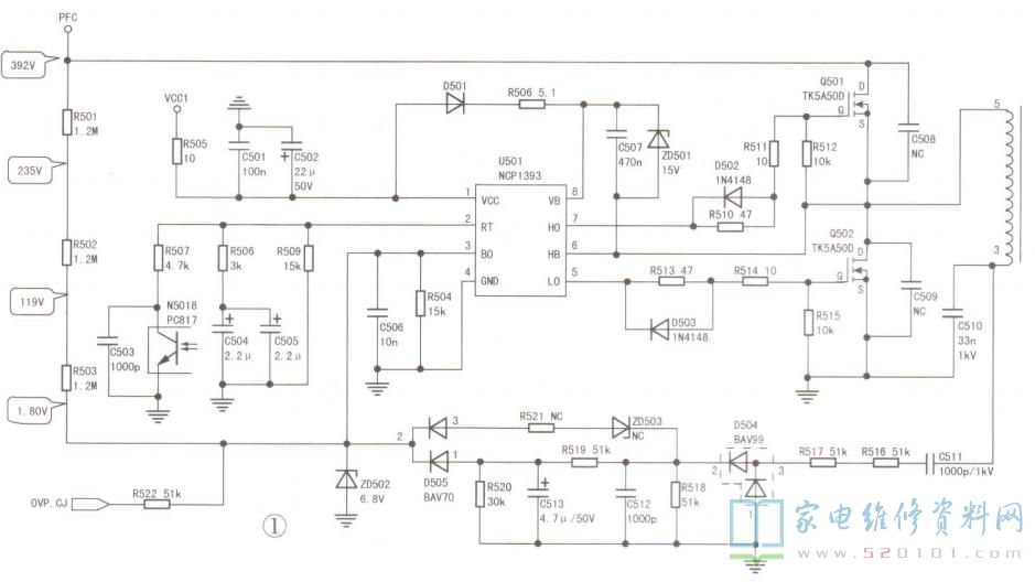 此种情况的具体表现为:二次开机后+12.3V、24VA输出电压正常,但LED+背光供电在开机瞬间较高,然后迅速下降(正常值约为63.5V)。该二合一电源使用半桥PWM控制器NCP1393(U501)形成LED+电压,如图1所示。U501①脚是供电端,该脚电压在未启动时约为13.8V,启动后电压约为11V。当测得⑧脚电压为205V (未启动时约为14.2V)、⑤脚电压为4.78V时,即可判定IC已启动。