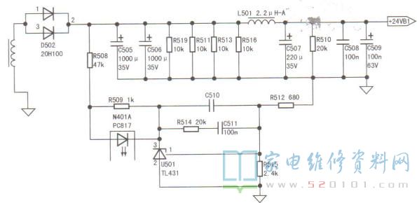 接修一台长虹58Q1N液晶电视(ZLM50H-iS机芯),故障表现为上电后指示灯亮,不开机。检测电源板输出的12.3V电压正常,但24V输出电压只有20V。断开LED驱动板供电插座coN401后,24V输出电压仍偏低,判定故障由电源板引起。该机采用HSL50S-1M2型电源,24V稳压取样电路如图所示。检测U501(TL431)、N401(PC817)及外围元件都正常,补焊C510、C511后试机,24V输出电压正常,故障排除。