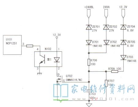 目测12V滤波电容未见异常。测U101工作条件,发现③脚(过功率检测)瞬间电压升至2.89V,而正常电压应为0.2V。U101③脚外接12V 及双24V过压检测电路,如下图所示。断开N102开机,故障消失,说明故障在N102所接的电路中。经查,ZD705软击穿,换新ZD705后试机,故障排除。