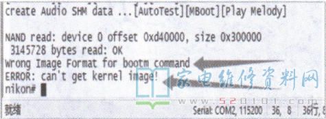 该信息提示无法获得内核信息。首先测量主芯片U61 (MSD6188) 与U62(GD5F1GQ4UA)的3.3V供电和总线电压,均正常;用u盘刷机,进度条到45%后机器自动重启,故障依旧,怀疑NAND存储器性能不良。于是先用镁光NAND存储器(MT29F1G01AAADDH4)代换原U62(GD5F1GQ4UA )存储器,然后用串口工具写入ZLS53GI2的引程序,再用U盘升级主程序,升级完成后试机,故障排除。