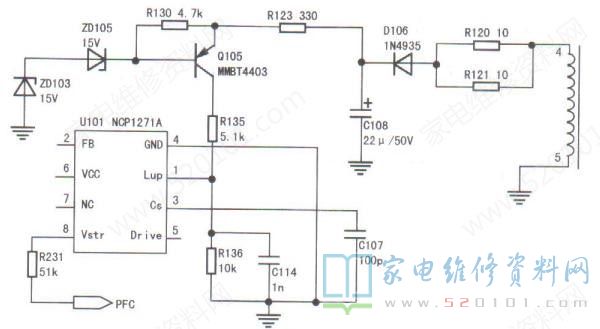 接修一台长虹55D2000i液晶电视,故障表现为有时不开机。在出现故障时,测量电源板输出的12.3V电压约为1.6V。断开主板与电源板的连接线后再测, 12.3V电压仍很低,判定故障出在电源板上。测量PFC电压与U101(NCP1271A)的供电均正常,但U101①脚电压偏高(正常时约为0.4V),检查U101①脚外围电路如图所示。
