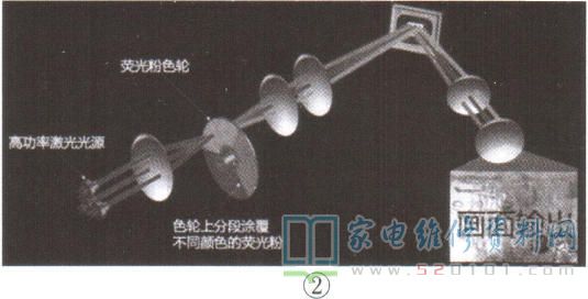 初始,激光电视主机并不能实现RGB三原色激光,而一般采用的是蓝色半导体激光发生器(单色激光电视)。其工作原理是将蓝色激光通过荧光粉色轮高速旋转,形成红色、绿色两种光源,从而产生RGB三原色,再通过DMD芯片,解析镜头将画面输出到激光电视的屏幕上。随着激光技术的更新,现在大都采用的是红、绿、蓝三种激光器来完成光束的调控,再通过DMD芯片完成图像显示。