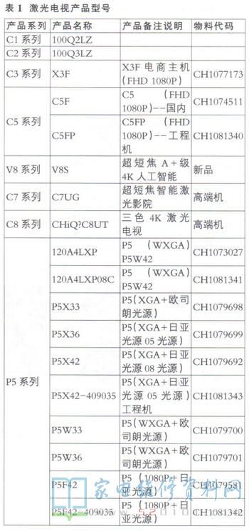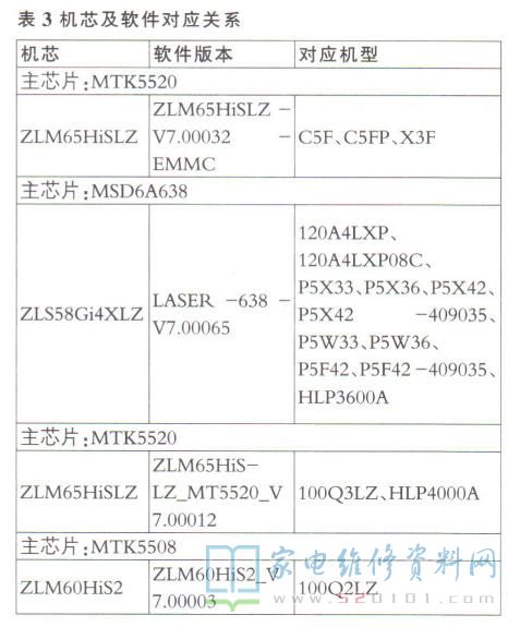 机芯及软件对应关系如表3所示,工厂菜单进入方法参照液晶电视方法即可。