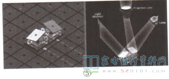 目前,激光电视仍然采用的是DLP投影技术实现图像显示,而DLP投影技术又离不开一个非常关键的芯片DMD。因DMD芯片是激光电视的成像核心器件,其上排列了数百万个小镜子,且每个小镜子都以每秒钟几万次的频率向正负方向翻转,那么光线通过这些小镜子反射在屏幕上直接形成图像。由于人眼的视觉惰性,会将高速轮换地照射在同一像素点上的三基色混合叠加,形成彩色斑斓的绚丽图像(激光电视采用反射式超短焦的方式),如图2所示。
