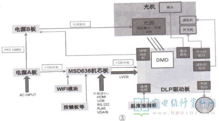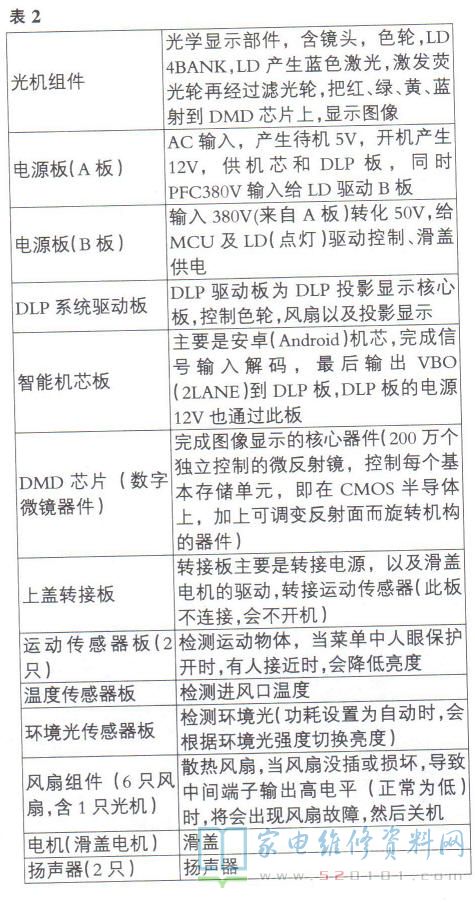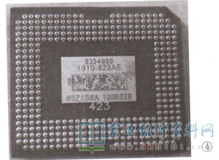 激光电视整机系统方框图如图3所示,C5F的DMD芯片(散热面如图4所示)是通过施加镜像复位脉冲,形成+12*状态(对应“开”像素)和-129状态(对应“关”像素),如图5所示,即控制对每个镜片光源的开/关占空比,实现RGB全彩图像。其电路组件及模块功能如表2所示。