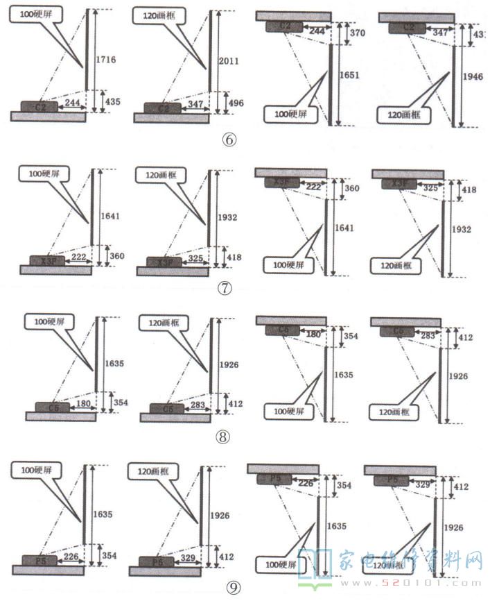 100英寸=1107/809,90英寸=996/728,80英寸=886/647,120英寸=1328/971,135英寸=1395,150英寸=1660。